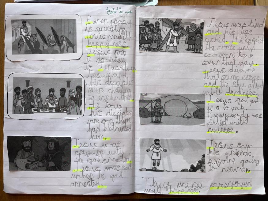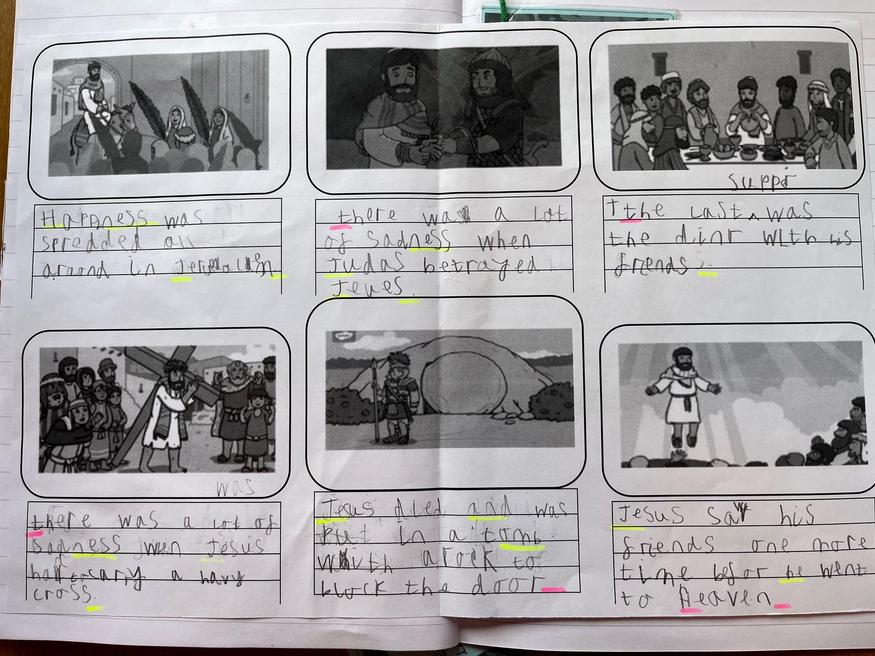 Firstly, we would like to say thank you to our grown ups for helping us to participate in the Easter Bonnet parade, we had so much fun! We have spent the week learning all about the reason behind Easter. KS1 have been learning about Palm Sunday and the resurrection of Jesus. Each child sequenced the story and then completed a feelings graph depicting different stages of the story. Our next step was to create a comic strip detailing the different events of Palm Sunday, take a look at some examples below. We hope you have an amazing Easter celebrating together.