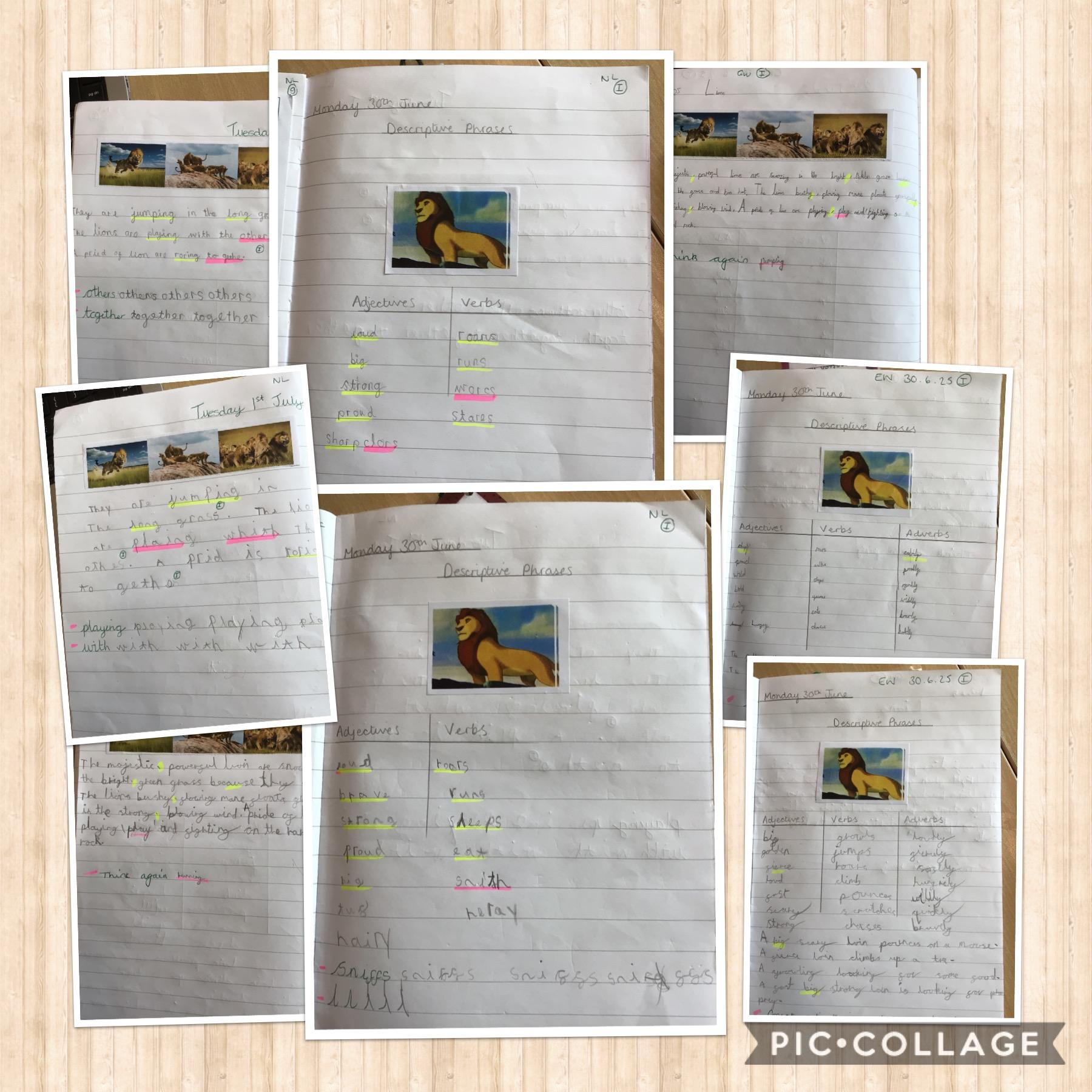 Well done to all Key Stage 1 who wrote some beautiful descriptive phrases about lions. The children used adjectives, verbs and adverbs to make their writing interesting. They were able to use ‘ly’ suffixes and linked ideas using conjunctions.