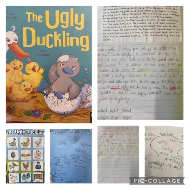 This week we have been busy using our phonic and spelling skills to write the story of 'The Ugly Duckling'. We used the pictures in our story maps created last week to help us remember each part of the story. In Year 1, we focused on writing simple sentences; in Year 2, we extended our sentences using conjunctions such as 'and, because, so'. We worked independently, trying to sound out and spell the words while remembering our beautiful Hazel Wood handwriting. Well done to all of the children for having a go and trying your best!