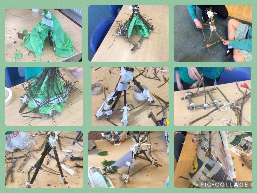 Back at school we used our sticks that we collected to build our shelters for Miranda, thinking carefully about how to make our structures strong and waterproof!